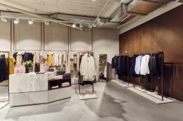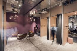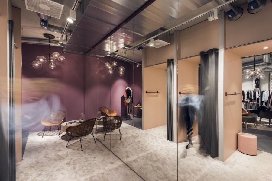Das Designkonzept von Mint Architecture spannt den Bogen zwischen der stilprägenden Architektur und den Anforderungen an einen innovativen, urbanen Fashion Store. Die helle Decke und eine sinnlich emotionale Farbpalette aus Weiss, Grau und Rosé stehen im Kontrast zu einem dunklen Gussboden und werden mit trendigen grafischen Elementen im Look der 80er-Jahre kombiniert. Davon zeugen unter anderem die partiellen tektonischen Deckenelemente sowie die drehbaren Wandelemente für die Warenpräsentation, die gleichzeitig die grosse Verkaufsfläche unterteilen. Für eine anmutige Atmosphäre sorgen aber auch auffällige Objektleuchten, die in unterschiedlichen Längen von der Decke hängen.