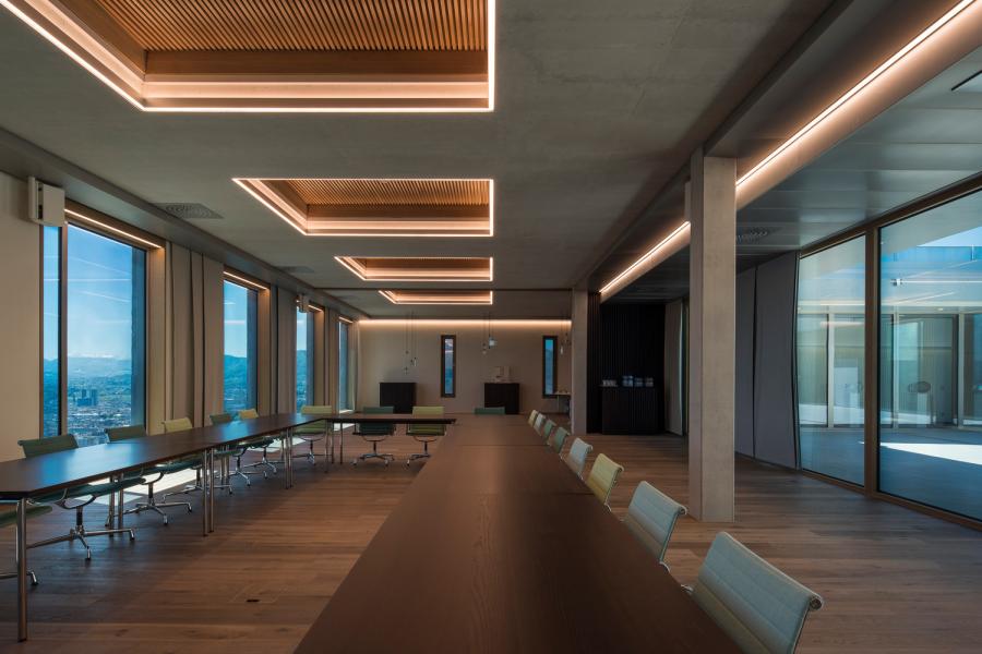 In Zürich befindet sich das 118 Meter hohe Gebäude der Swissmill, Kornhaus genannt. Der fensterlose Turm beherbergt 45 Silozellen, in welchen das Getreide getrennt nach Sorten gelagert wird. Lediglich in der obersten Etage befindet sich ein Konferenzraum mit Fenstern, welcher eine komplette Sicht auf die Stadt bietet. Aufgrund der Höhe des Raums und der einhergehenden Windlasten, war das Anbringen eines aussenliegenden Sonnenschutzes ausser Frage. Überdies sollte eine uneingeschränkte Sicht auf und über Zürich auch bei starker Sonneneinstrahlung möglich sein. Durch die innovative Sonnenschutzlösung von SageGlass, können die Scheiben in vier Stufen reguliert werden und somit vor grellem Sonnenlicht, sowie vor Wärmeeintrag schützen. SageGlass ist somit eine Komplettlösung, die ein angenehmes Raumklima und eine stets freie Aussicht auf die Stadt Zürich bietet.